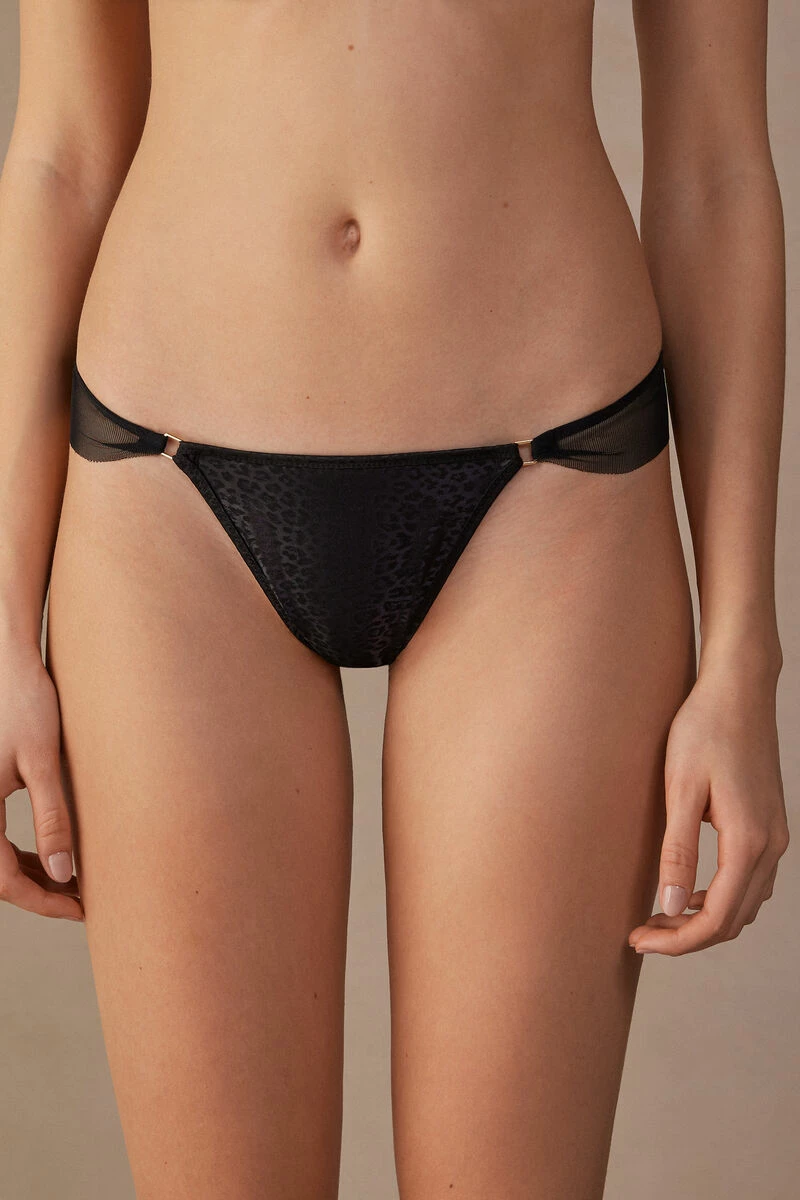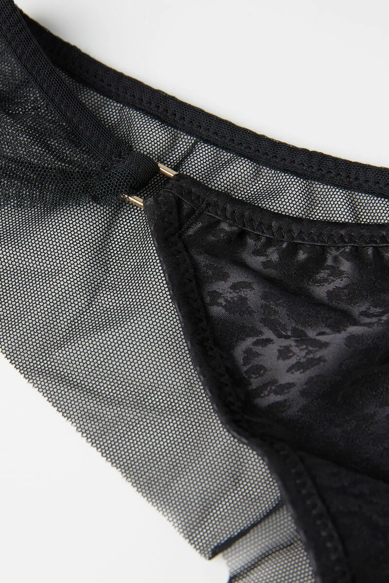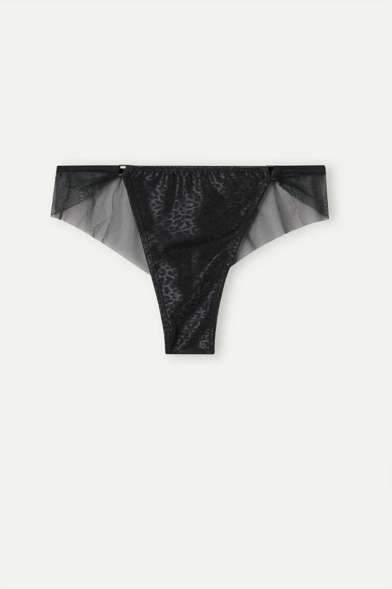Brazilian briefs made of animal-pattern jacquard satin with sides and back in soft raw-cut tulle. Square jewel accessories. 100% cotton gusset.