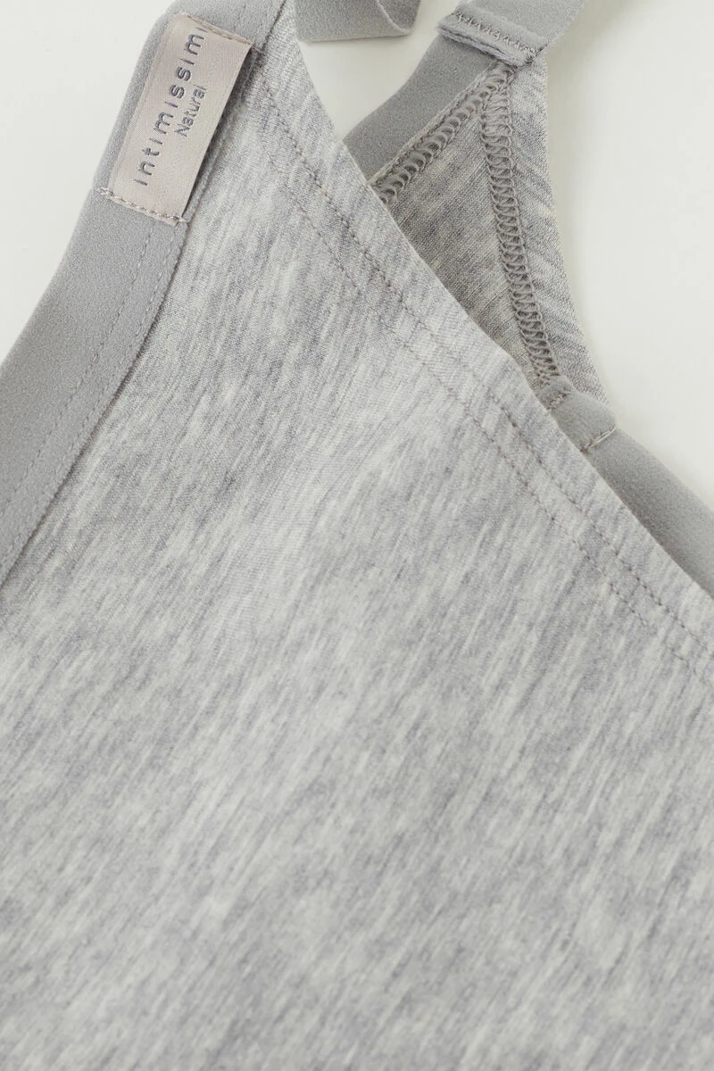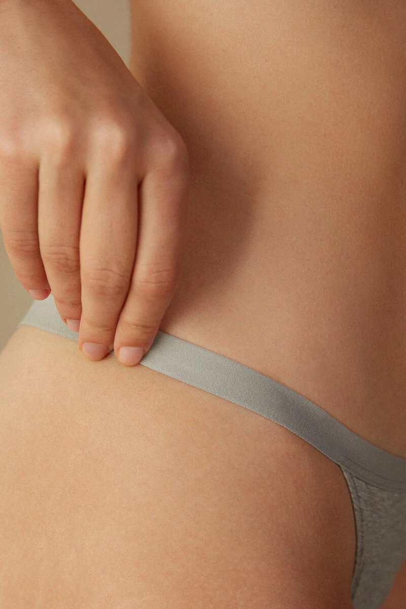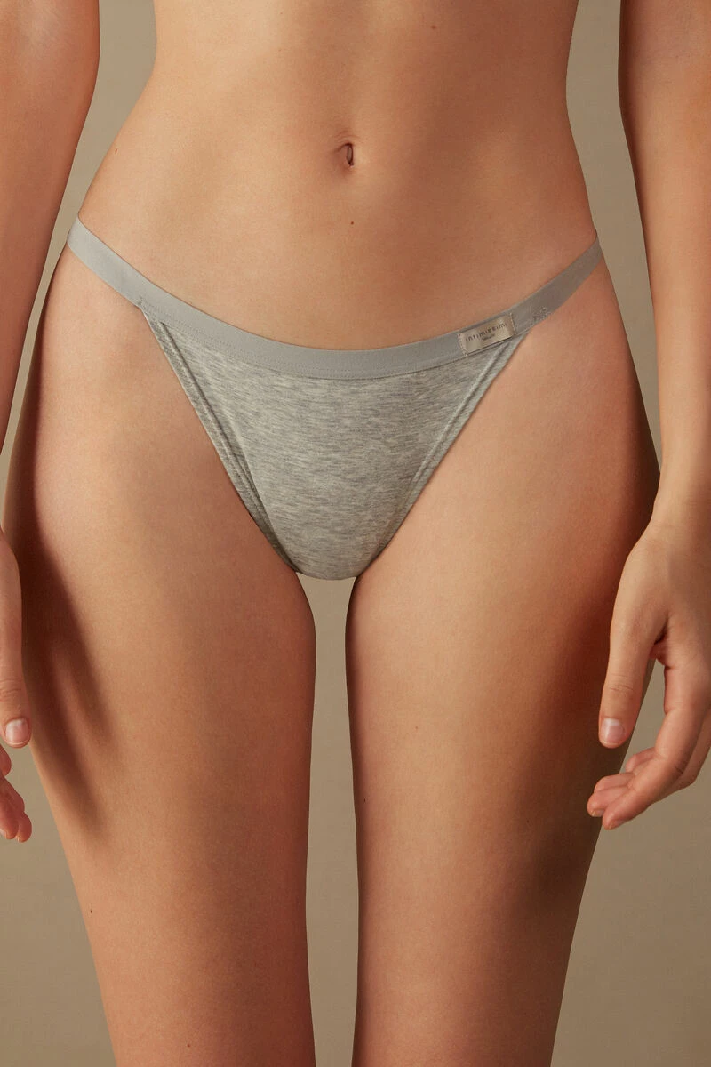 Slightly elasticated cotton thong with thin side straps. The waistband and back band have very soft and light elastic. Low waist. 100% cotton gusset.