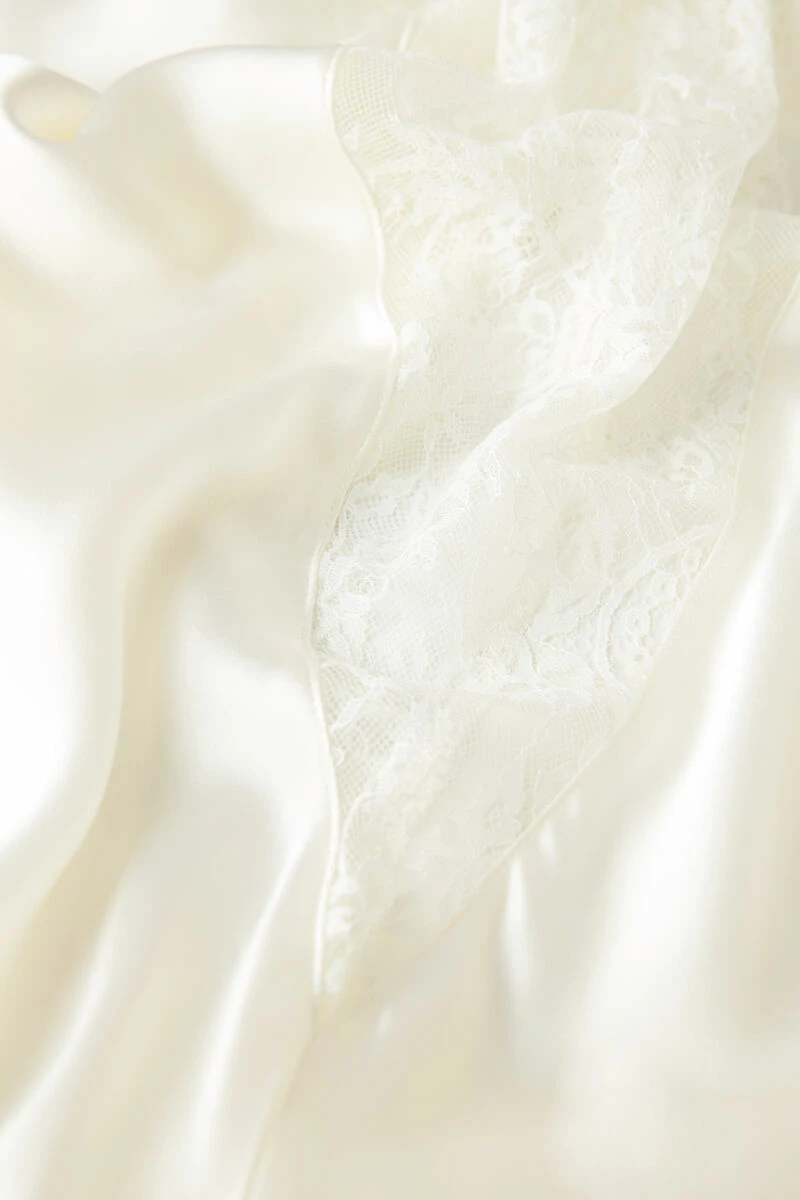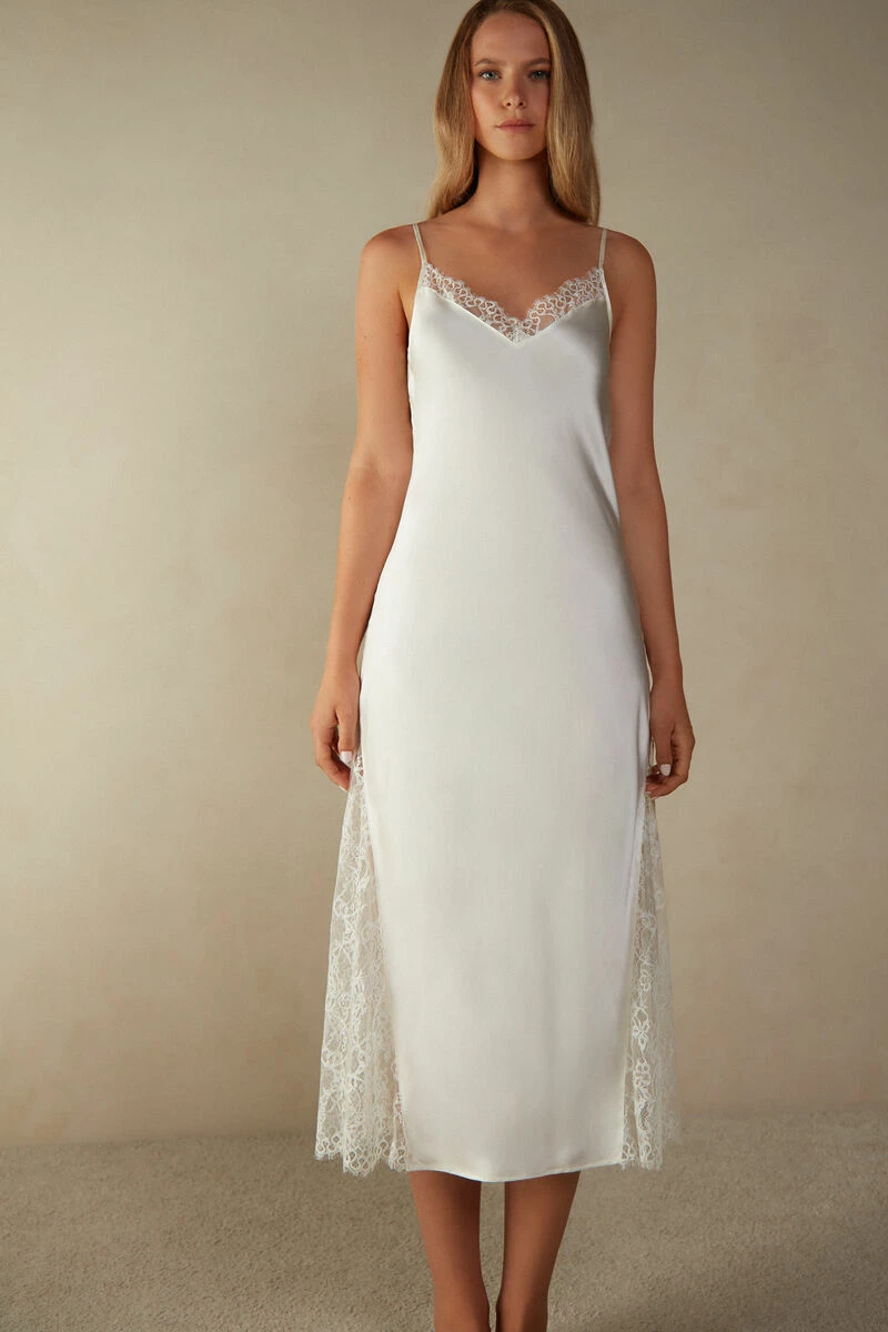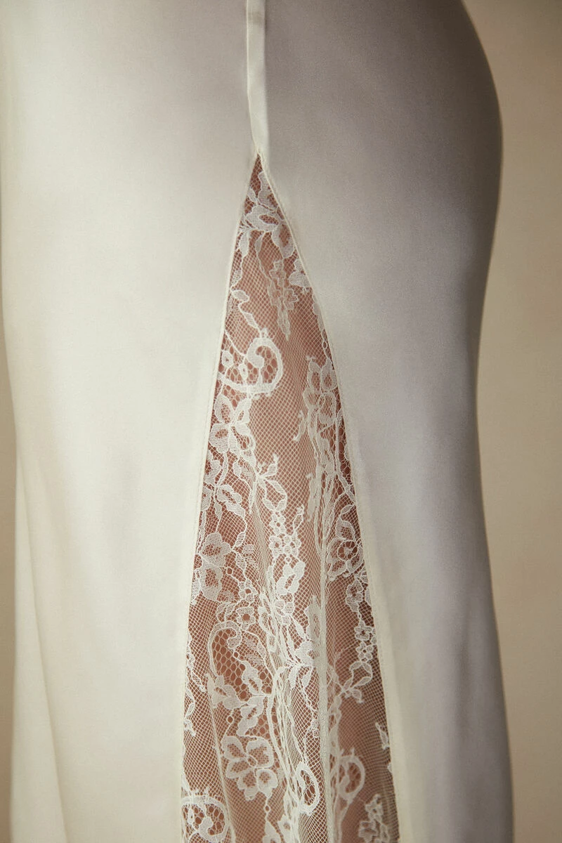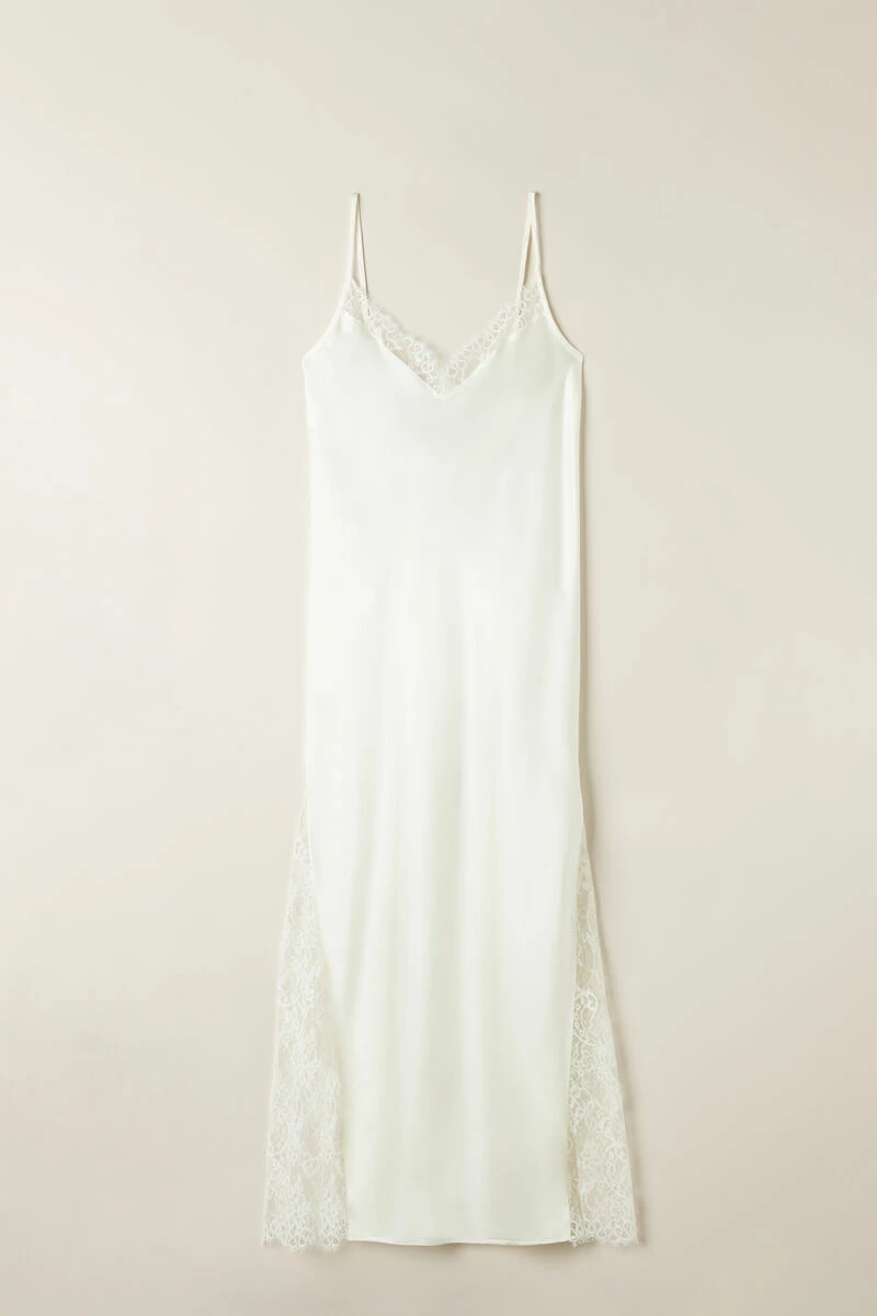 Long silk satin slip with lace-flounced V neck and crossover detail on the back. Intricate lace flounce inserts which create a mischievous and sensual transparent effect at the sides. Adjustable spaghetti straps.