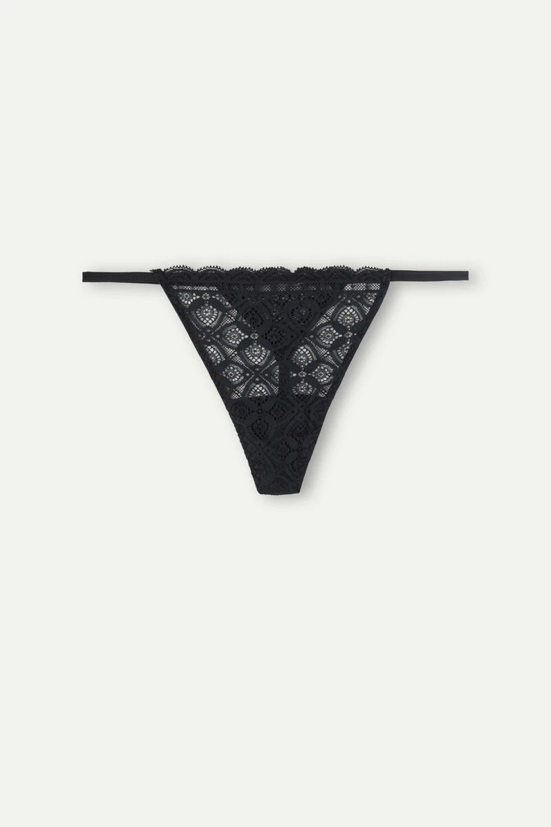 Stretch lace thong detailed with a geometric design and romantic frills. The thin side straps are made from stretch microfibre. 100% cotton gusset. Particularly suited to those looking for a sensual invisible effect.