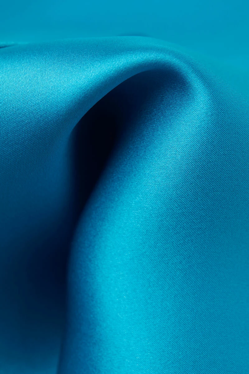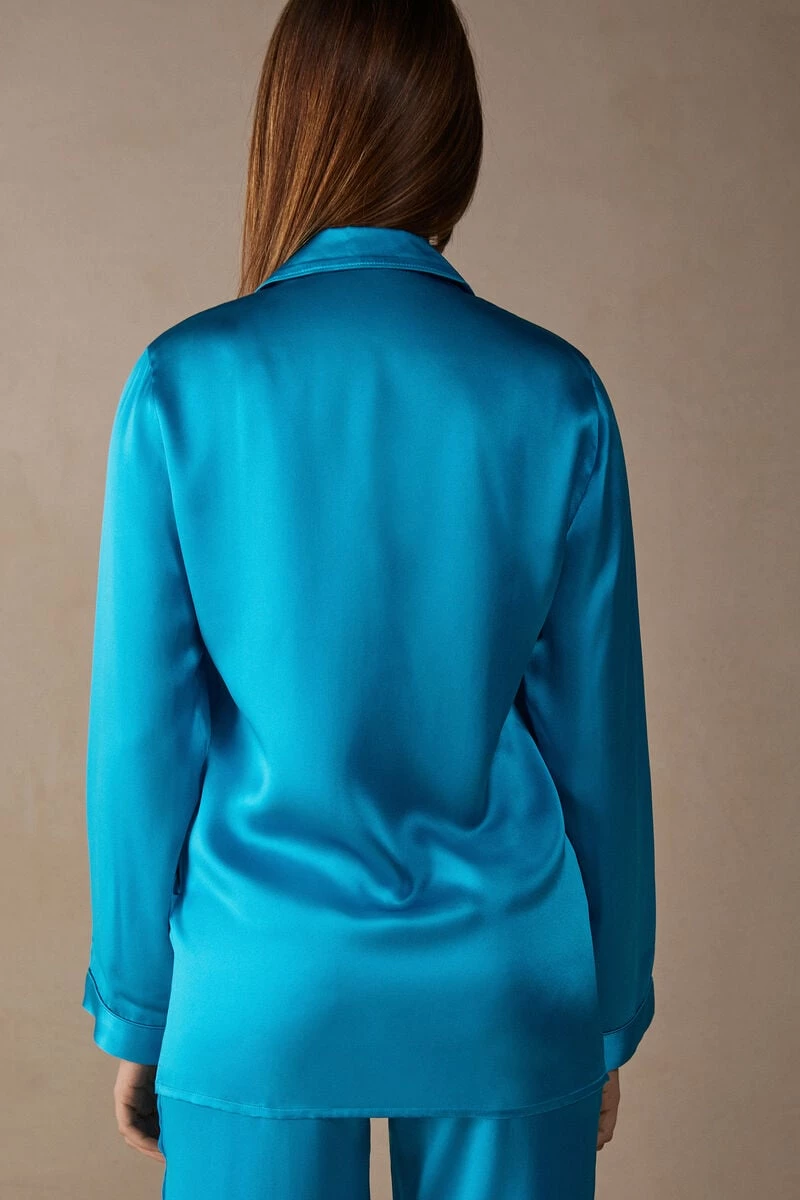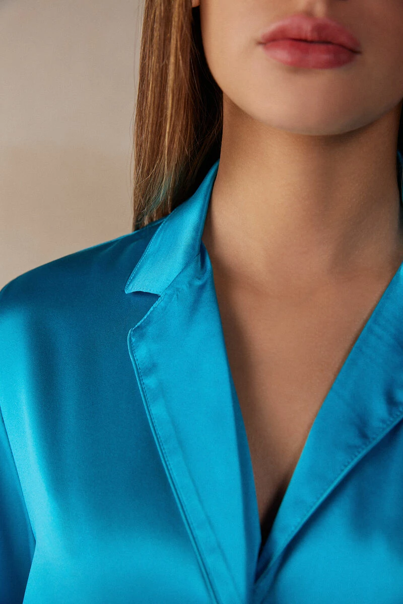 Long-sleeve mannish-cut jacket in silk satin. Contrast-colour trim detail on the neck and cuffs. The model is 179 cm tall.