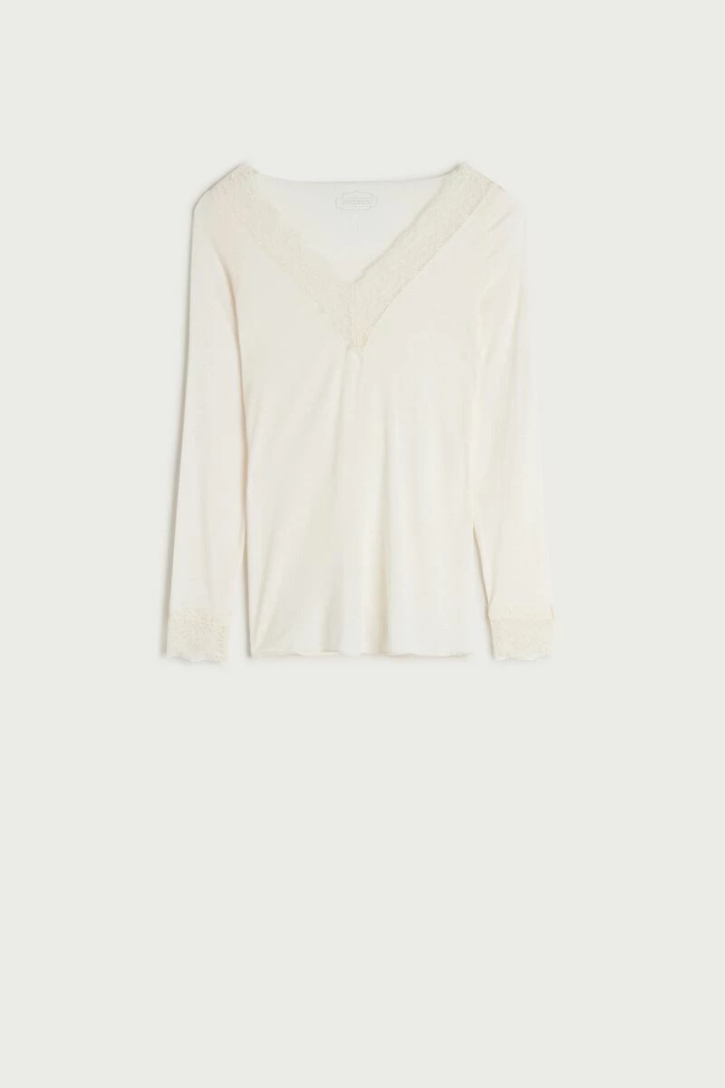Long-sleeved modal cashmere ultralight shirt enhanced with lace.
