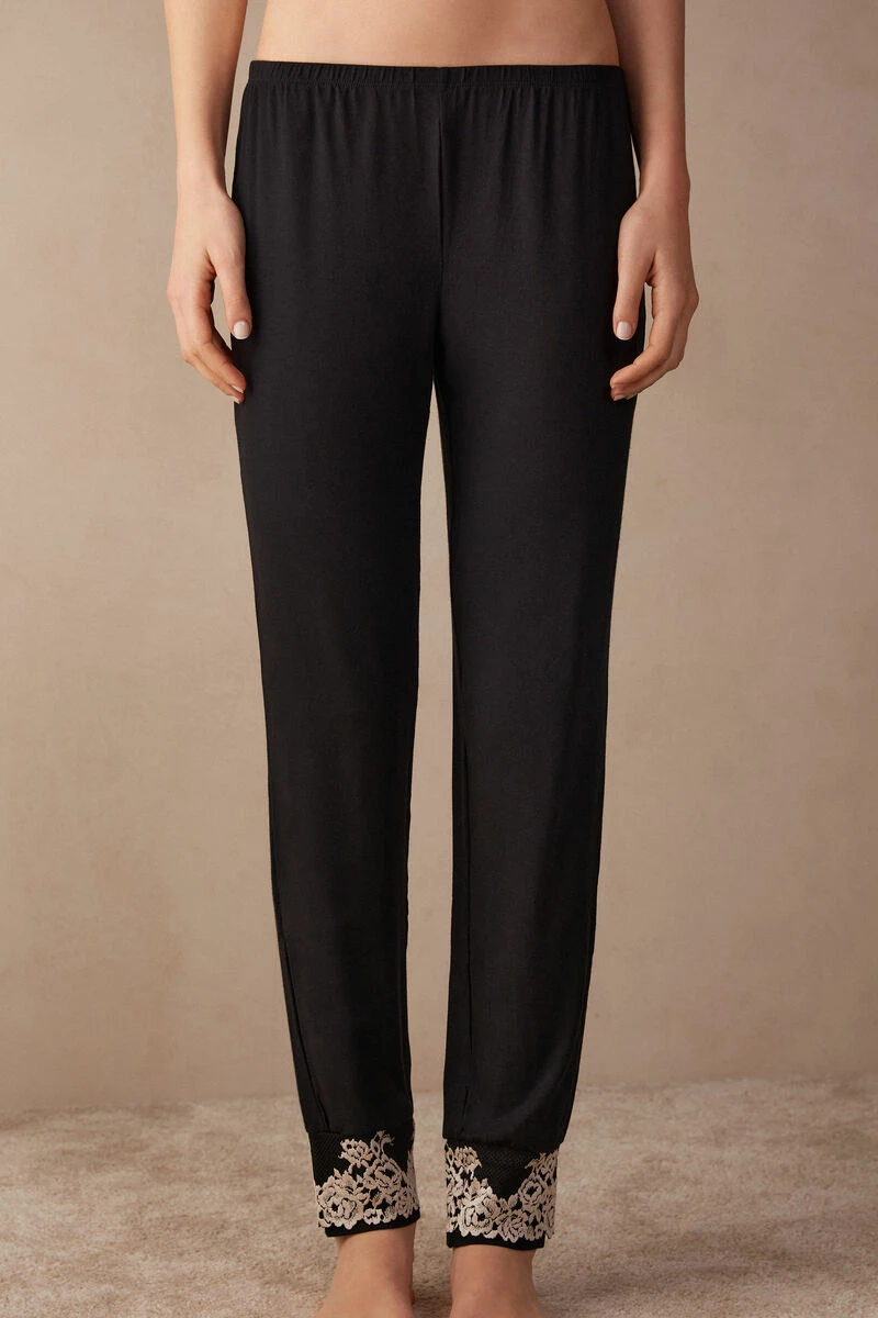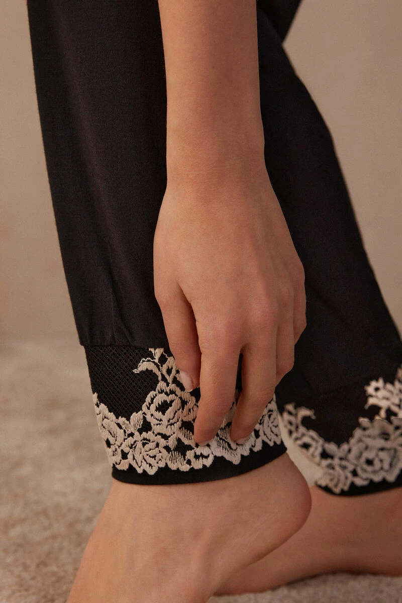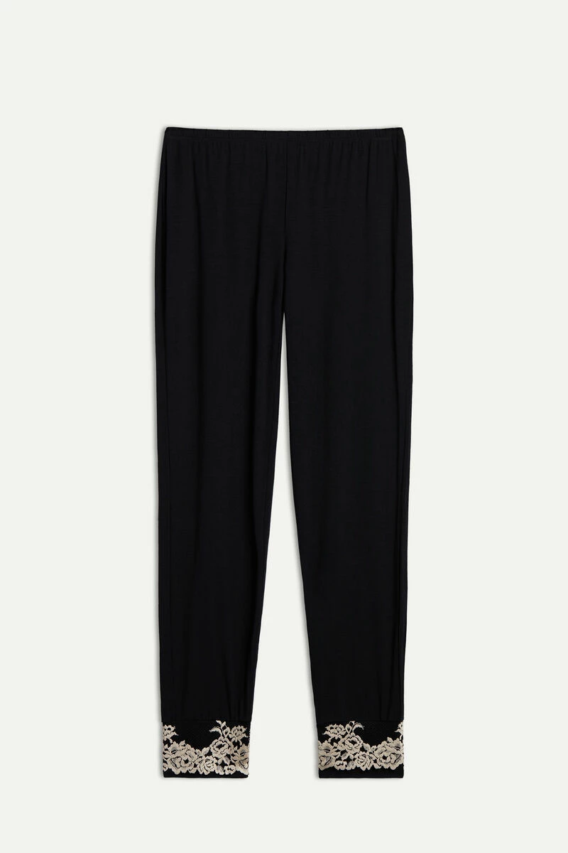 Full-length trousers in modal with deep cuffs on the ankle, embellished with a two-tone lace frill. Regular fit.