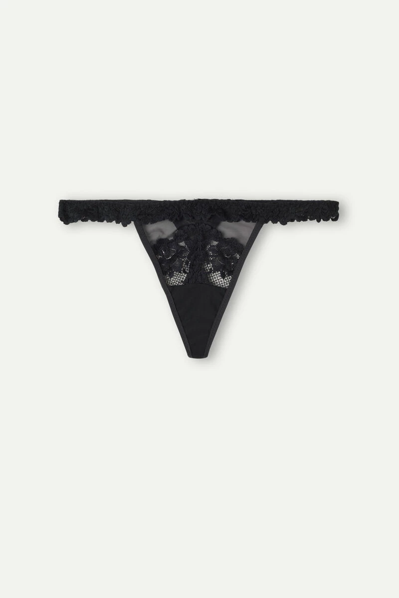 Thong with side straps crafted from lace and tulle, embellished with a lace frill. Depending on the colourway selected, the lace is contrasting or tone-on-tone. 100% cotton gusset.