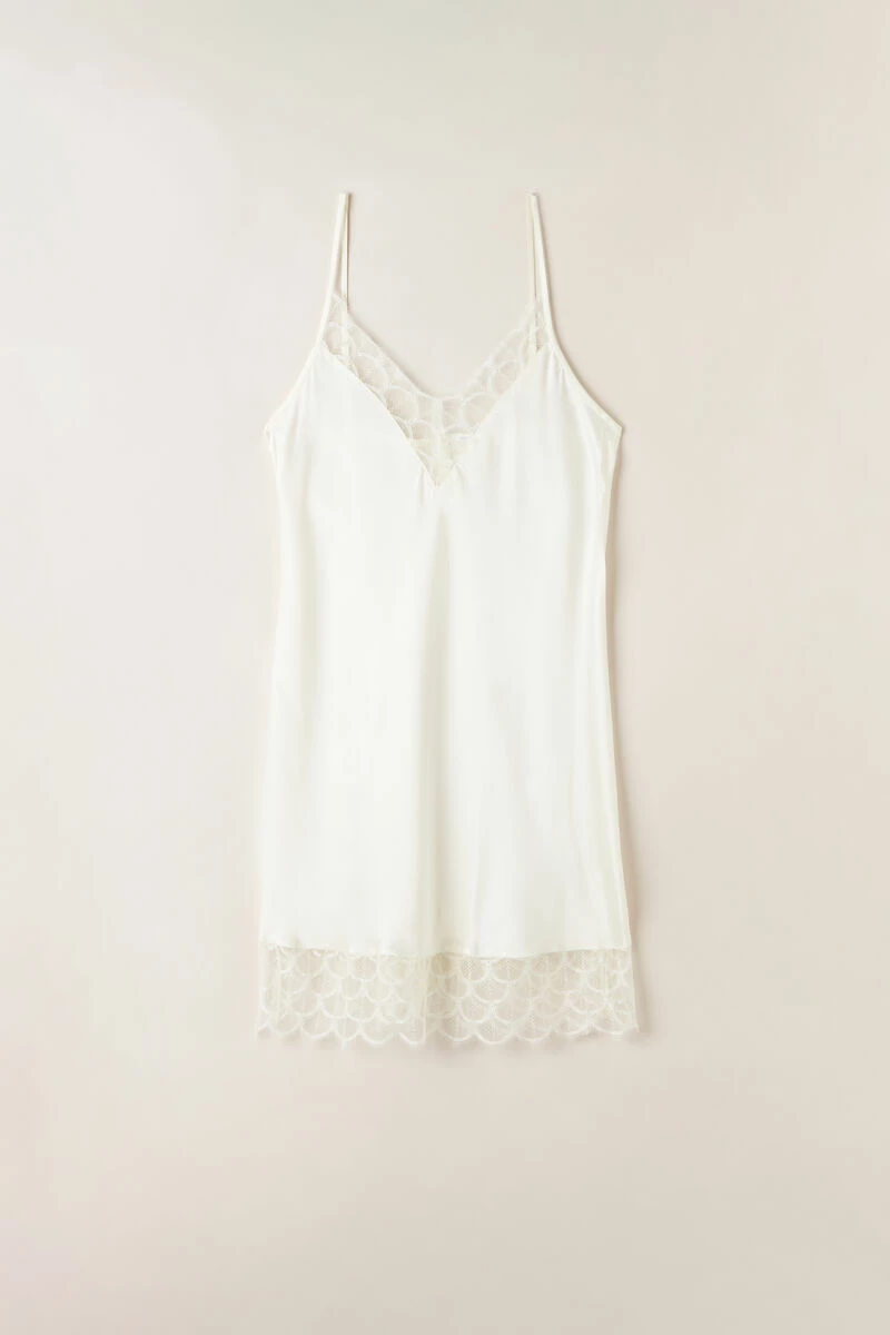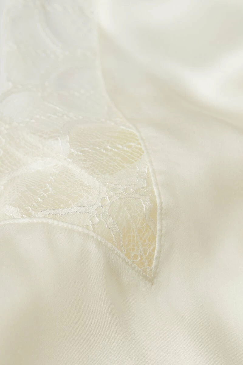 Silk satin V-neck slip embellished with an elegant geometric pattern lace flounce. Adjustable spaghetti straps. Regular fit.