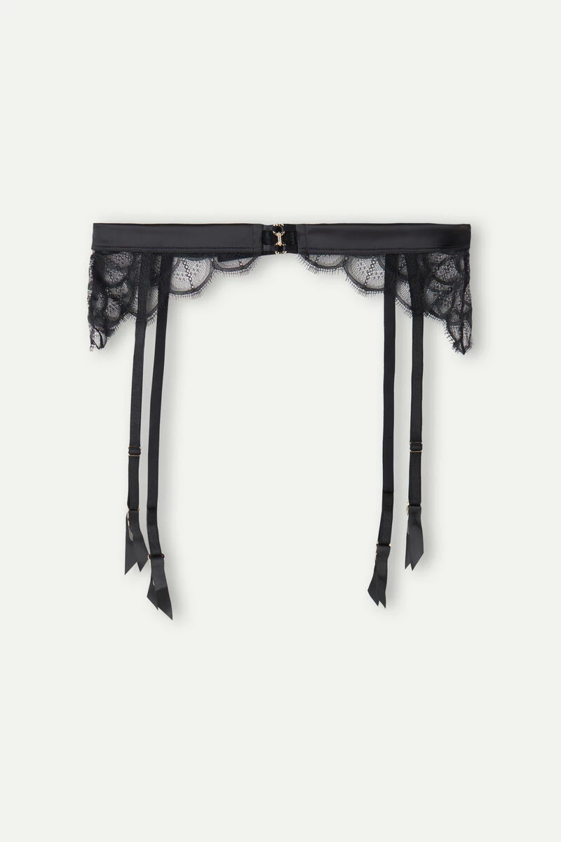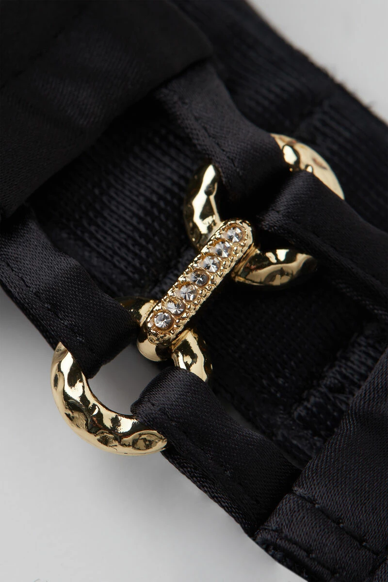 Suspenders with soft stretch satin waistband and elegant geometric pattern details. A golden accessory with small rhinestones embellishes the waistband.