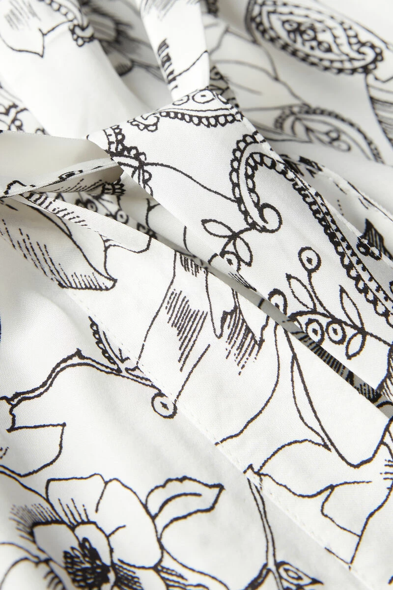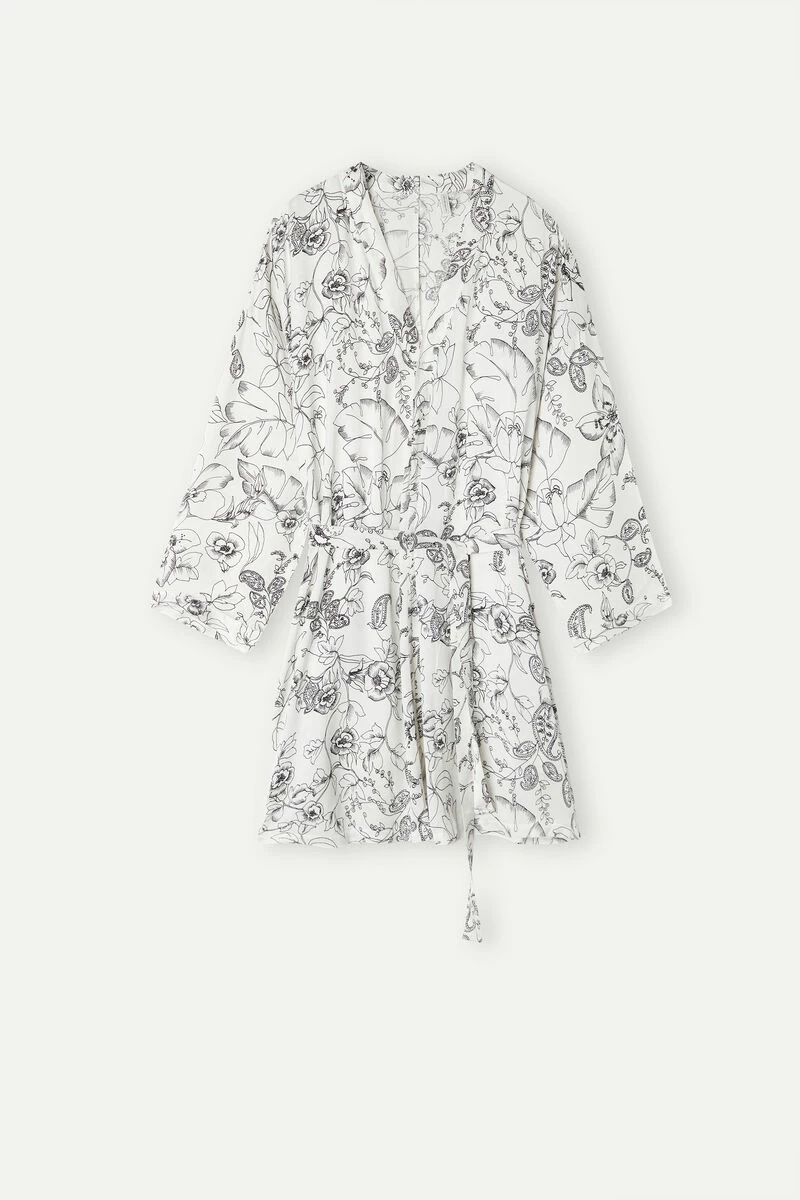 Floral-print viscose satin kimono-style dressing gown. Belted waist. Relaxed fit.
