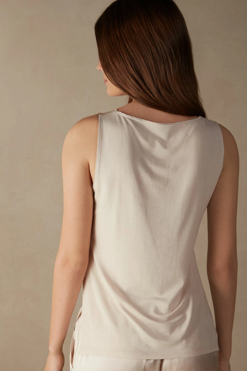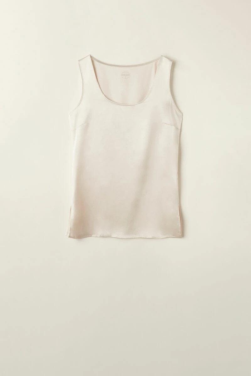 Vest with wide straps and rounded scoop neckline. The front is made from pure silk satin and the back is made from soft modal. The darts on the chest and the side slits make the fit even more comfortable. Relaxed fit.