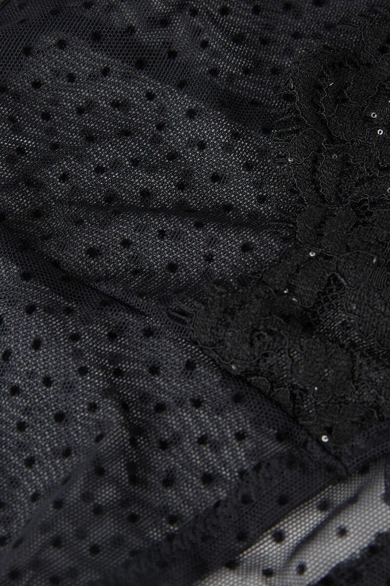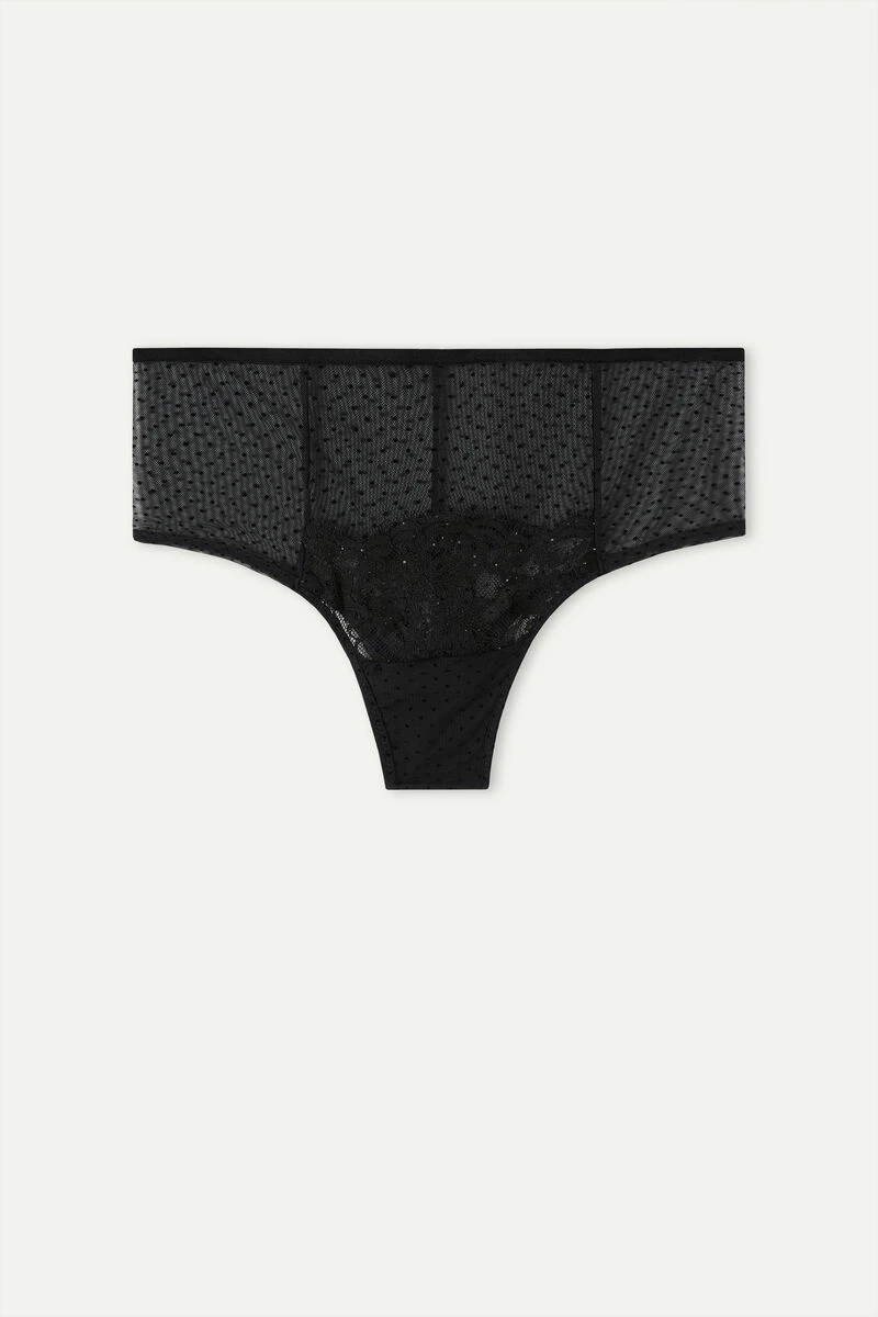 Soft flocked tulle French knickers detailed with micro-sequin embellished lace. Elegant velvet-effect elasticated waistband. 100% cotton gusset.